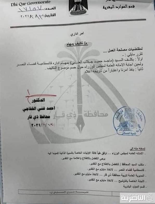 وذكر الخفاجي وفق وثيقة حصلت شبكة اخبار الناصرية نسخة منها انه تم تكليف ماجد حميد جلاب العتابي بمهام ادارة قائممقامية قضاء النصر.