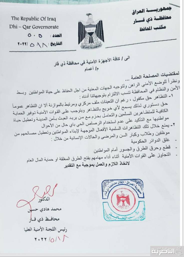 وثيقة: محافظ ذي قار يحث على حماية المتظاهرين ويوجه بمنع غلق الدوائر وقطع الطرق والجسور