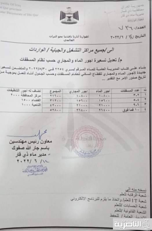 وذكر باسم جار الله لشبكة اخبار الناصرية ان المديرية العامة للماء وجهت كتاباً لجميع المديريات في المحافظات حول التسعيرة الجديدة للجباية وهي اسعار مضاعفة تصل الى ثلاثة اضعاف المبلغ السابق.