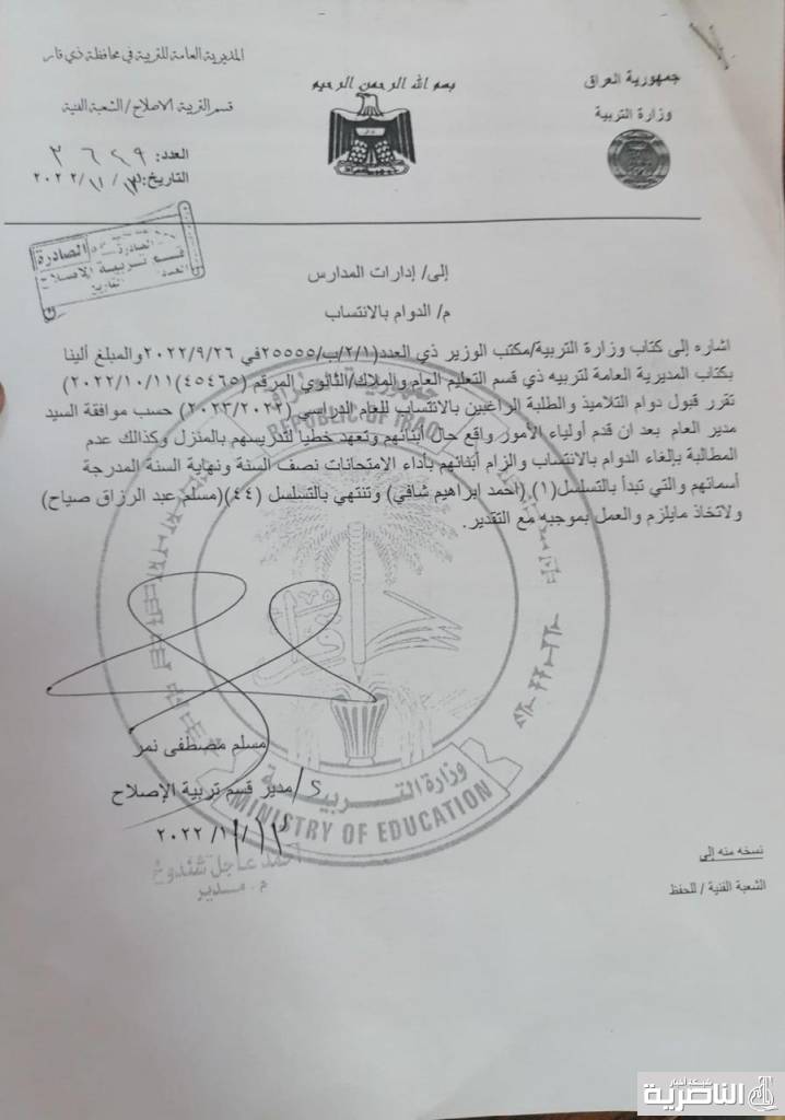 اعلنت تربية قضاء الاصلاح عن قوائم الوجبة الاولى من اسماء الطلبة الذين استحصلوا موافقة مدير عام التربية للدراسة بالانتساب.
