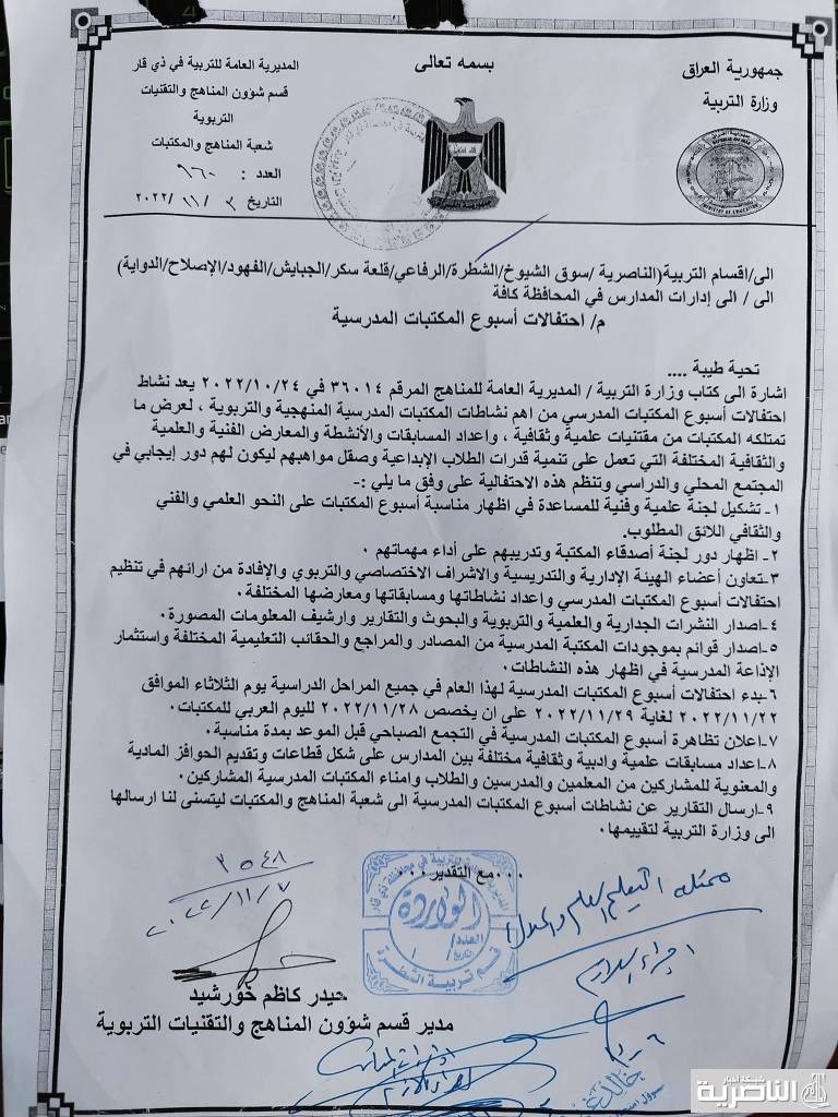 وجَّهت مديرية تربية ذي قار مدارس المحافظة بإقامة فعاليات يوم المكتبة المدرسية وتستمر 8 ايام.