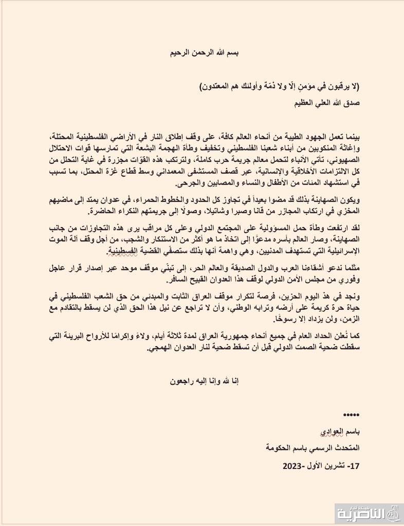 العراق یعلن الحداد علی شهداء مستشفی المعمداني في غزة